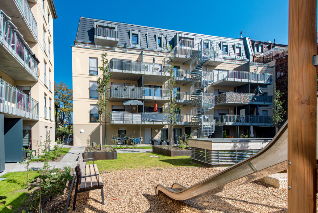 Bei dieser 2020 fertiggestellten Immobilie handelt es sich um einen Neubau von zwei Wohngebäuden (38 Wohneinheiten) sowie einer Sanierung eines denkmalgeschützten Bestandsgebäudes (4 Wohneinheiten). Insgesamt stehen rund 2.819 m² Wohn­fläche und 21 Tiefgaragenstellplätzen zur Verfügung. Von den 42 Wohneinheiten werden 36 öffentlich gefördert.